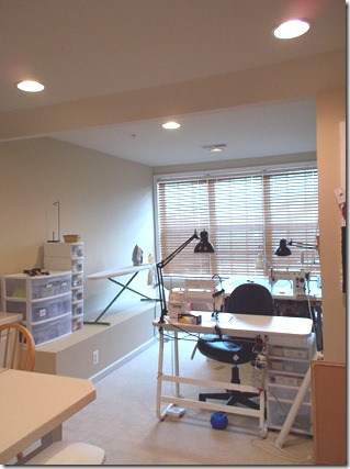 The next space is where the redo work will be done. See that ledge, along the far wall with the ironing board on it? Its going to be torn out, so this nice neat space will be changing to a mess again very soon!!! Of course I will have another dilemma- there probably isn’t any carpet under the ledge, so I will have to decide what to do about it…. the carpet in the space is in good condition so replacing all of it is out of the question.